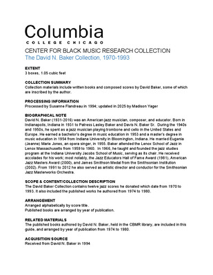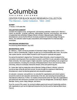 The Center for Black Music Research Collection contains materials that reflect many areas of Black music including collections from composers, ethnomusicologists, music researchers, music journalists, and also scores, published music, and audiovisual collections across all genres. These collection guides, or finding aids, provide access to materials held in archival special collections. The guide describes the organization and offers content information so researchers can discover relevant information.